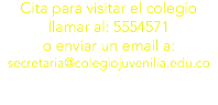 Cita para visitar el colegio llamar al: 5554571 o enviar un email a: secretaria@colegiojuvenilia.edu.co